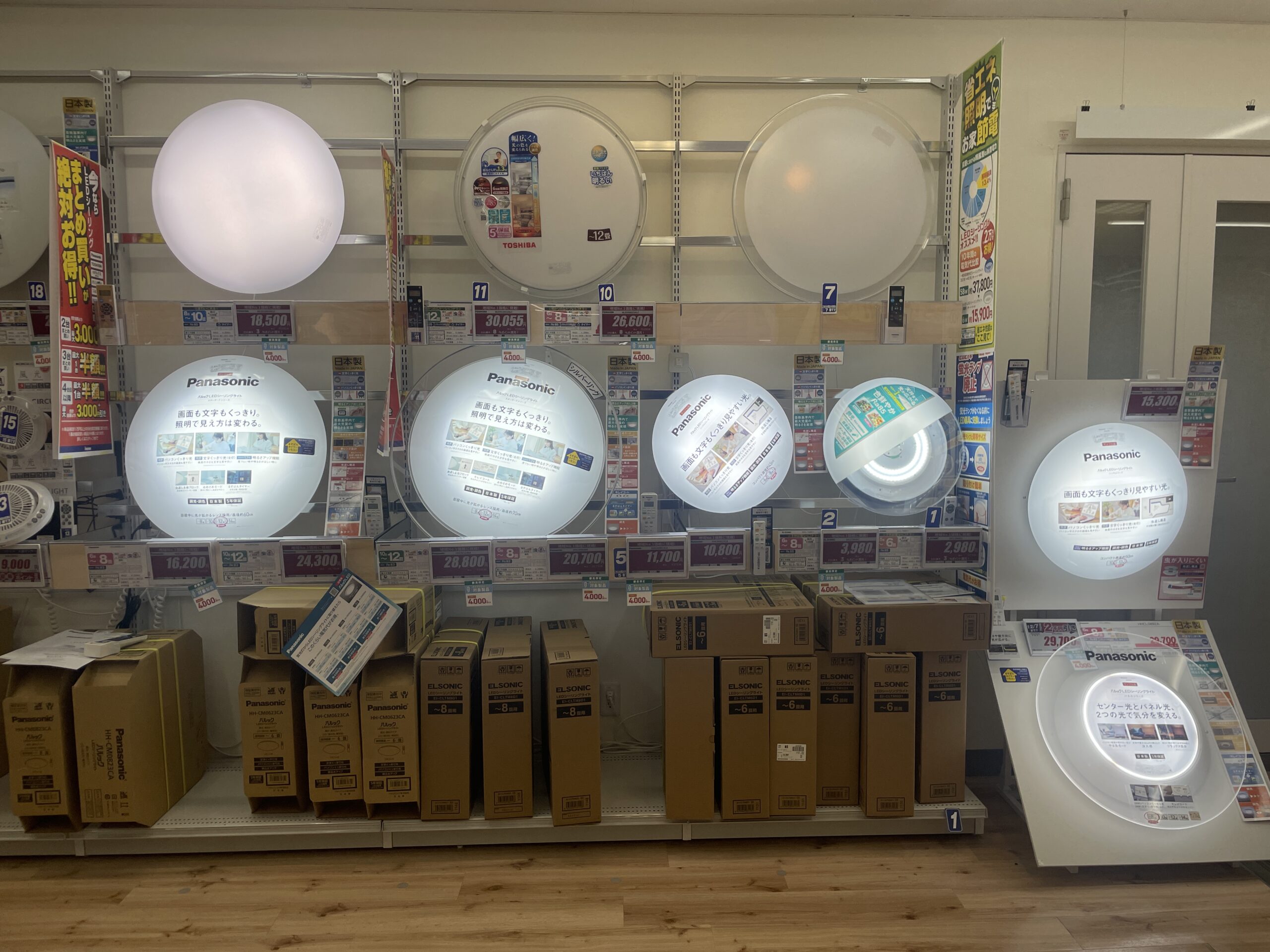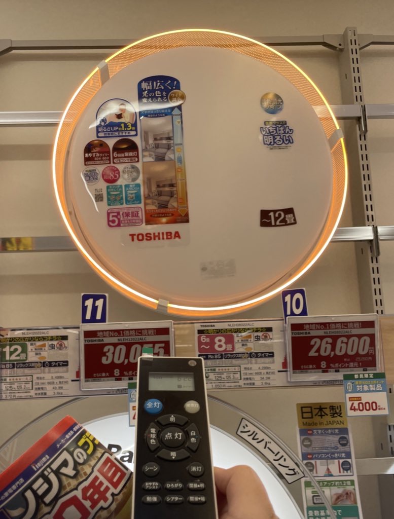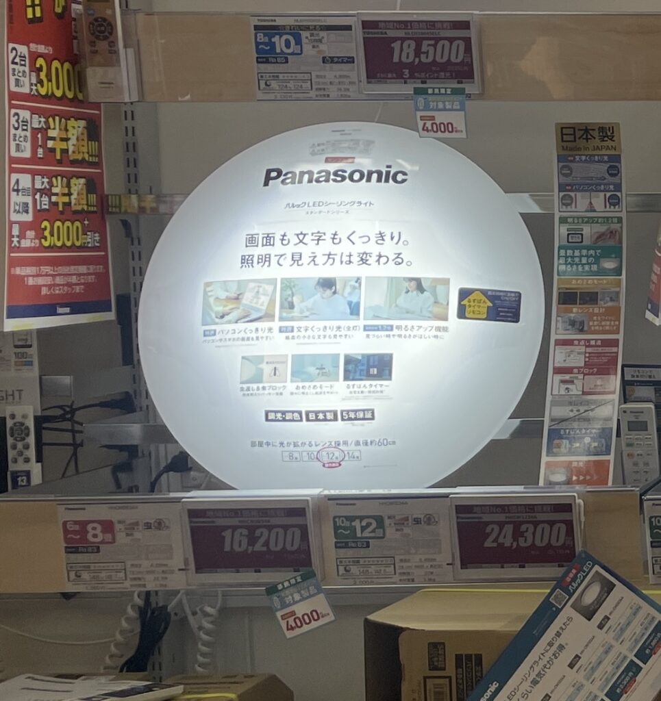 店頭に並ぶシーリングライトは、そこまでバリエーションが多くはなくパナソニック、東芝、ノジマ自社ブランドの3択だった。悩む範囲が狭まるのでタイパ的にはありがたいかもしれない。