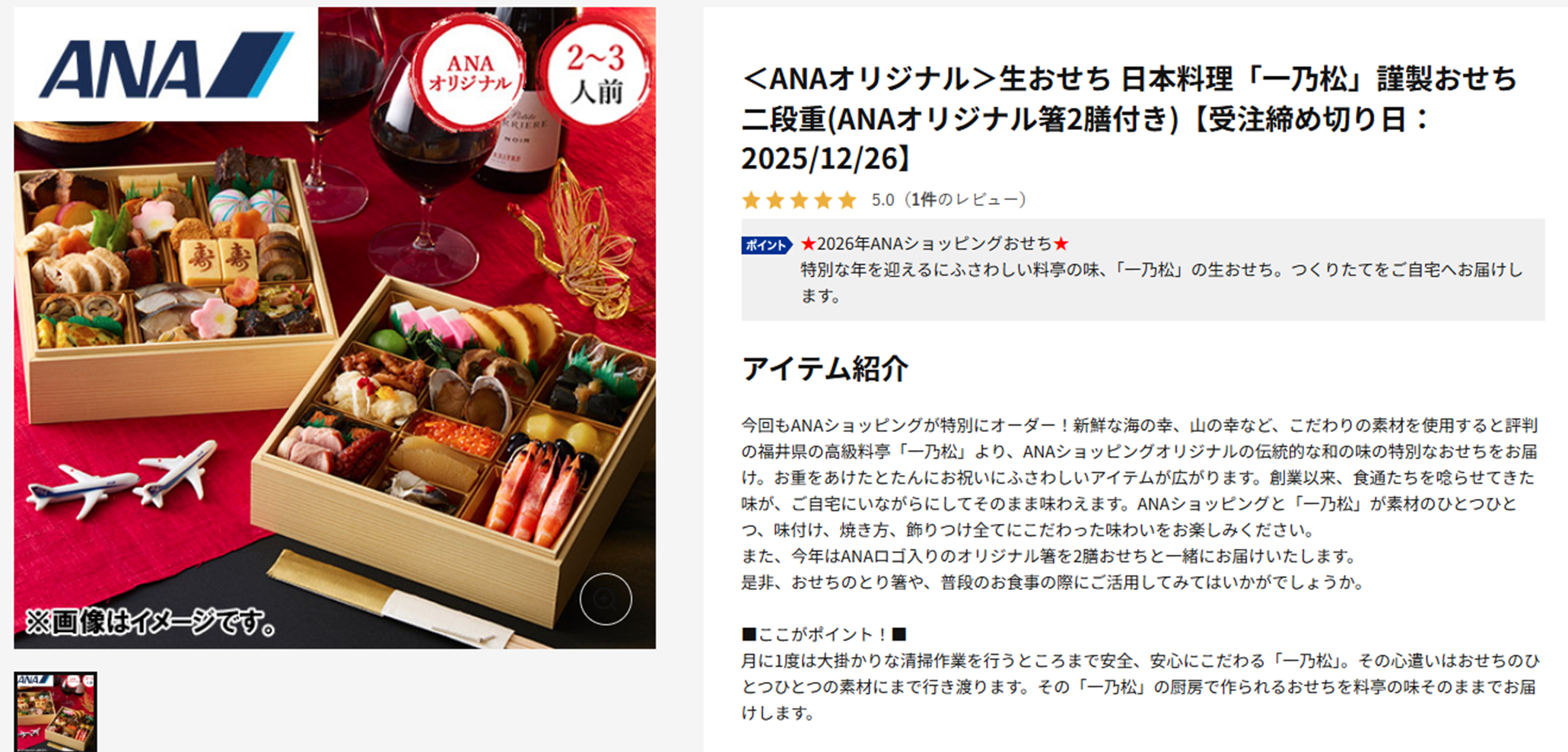 <ANAオリジナル>生おせち 日本料理「一乃松」謹製おせち二段重(ANAオリジナル箸2膳付き)【受注締め切り日:2025/12/26】