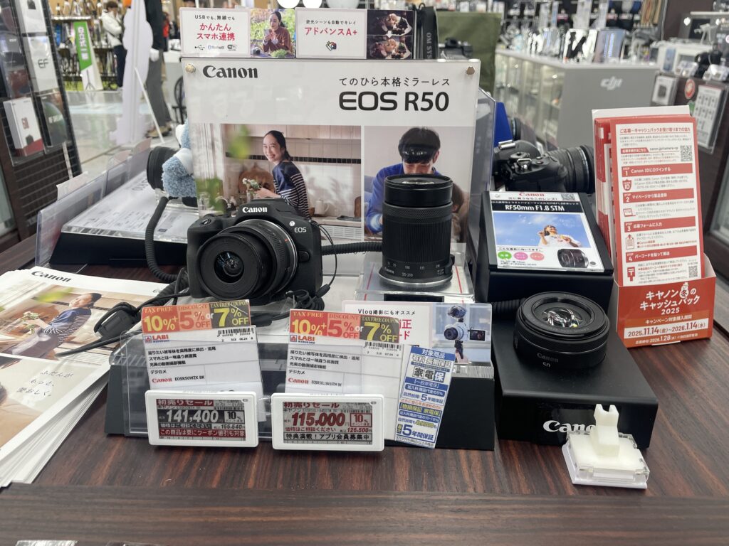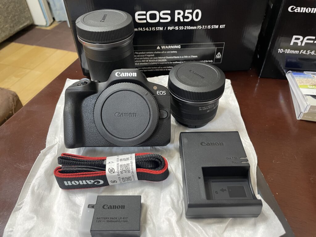 はじめてのキャノンで、ミラーレス一眼の「EOS R50」のダブルレンズキット(EOSR50WZK BK)です。ミラーレス一眼のエントリーモデル。