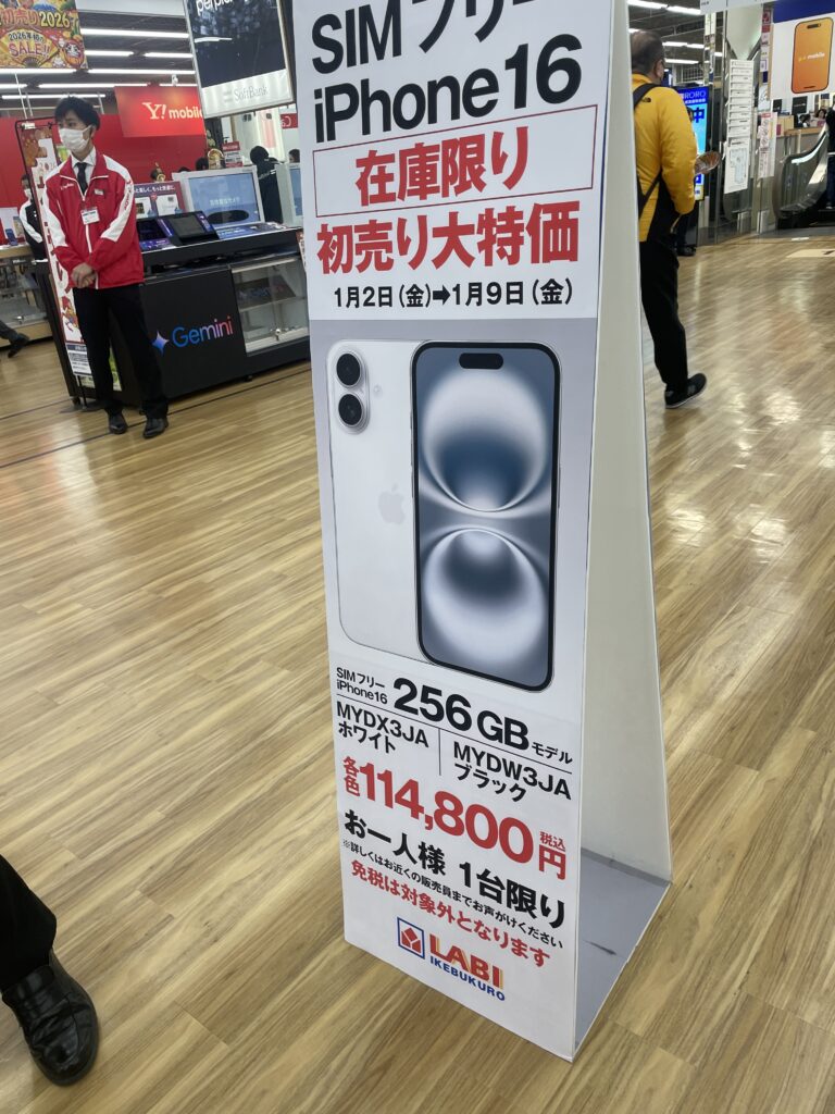 本日1/4、iPhone16 256GBを購入。池袋のヤマダデンキにて。初売りセールを狙って。