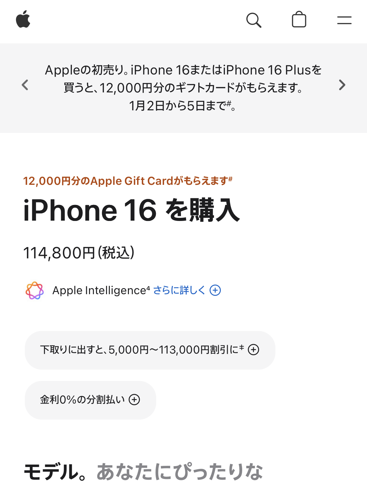 ちなみにアップル公式ストアでは、iPhone16は128GBしかなく、色は選べて同じ114800円。そこから初売りで12,000円のギフトカード還元をやっていた。