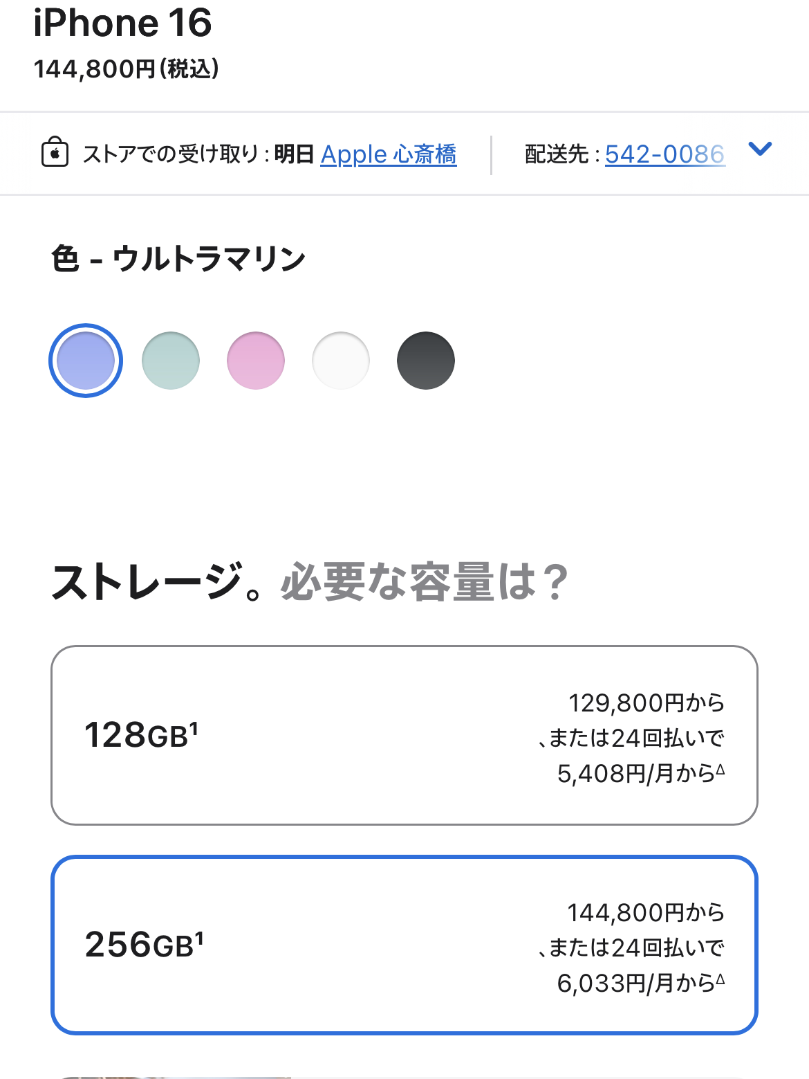 iPhone16Plusであれば256GBがあり144,800円。