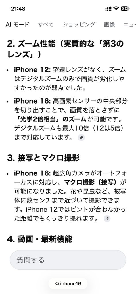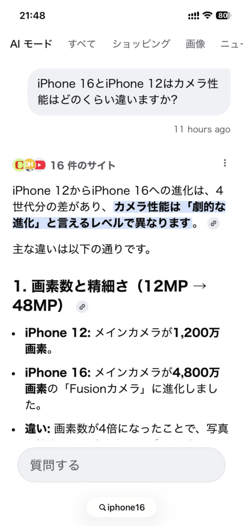 それからiPhone12と16の違いをGeminiに聞いた回答も後押しになった。