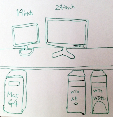 そんなに必要?って言われると全部は必要なかったりもして、主に使っているのはMacG4とWindowsVistaマシンの2台。もう1つはVistaマシンの前に使用していたWindowsXPマシン。