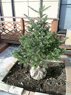 放置されてすっかり雑草やゴミに埋もれた花壇をきれいにしてモミの木を置く。