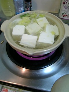 湯豆腐いいですね(^^) 白菜入れるんですね! うちは、昆布だしで豆腐だけでやります・・・あ!アクセントに器の方へキム入れたりする^^;