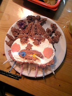 来てそうそうに義兄ちゃんが誕生日ときいて「おっと、それじゃなんかしよう」と即席ケーキを作りました。出来合いのスポンジに出来合いのホイップクリーム塗っただけ。今は便利なものがありますねー