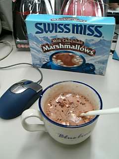 ホッとブレイク クリエーターの仕事 2006.02.24 3時になったのでちょと休憩♪ お気に入りのSWISS MISSスイスミスココア をいれてホッとブレイク。 小さなマシュマロがトロトロ溶けておいしい(^^) さて、もうひと踏ん張りがんばろーぅ